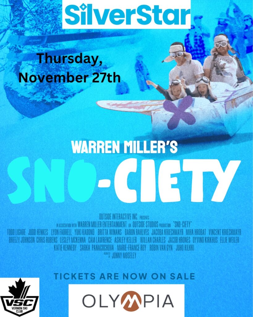 Join the Vernon Ski Club’s screening of Warren Miller’s film, Sno-ciety, at the Vernon Towne Cinema on November 27th. Doors open at 6 PM, and the show starts at 7 PM.